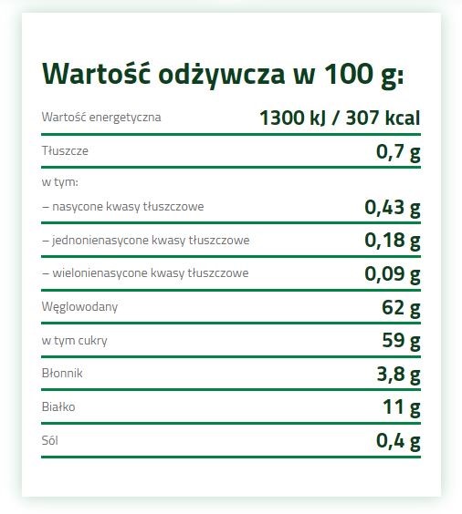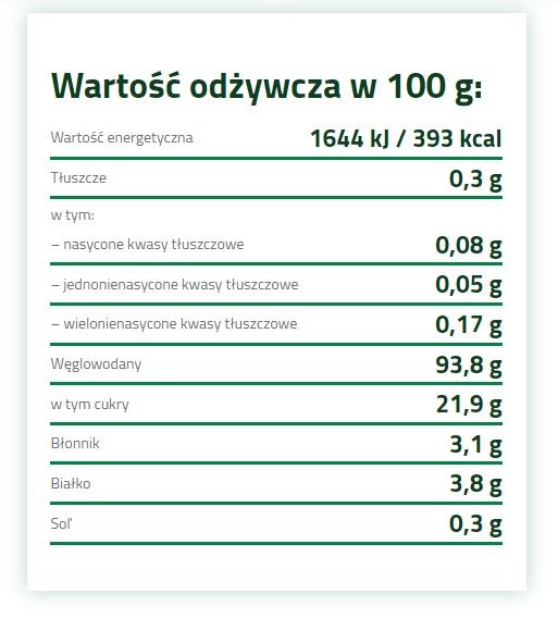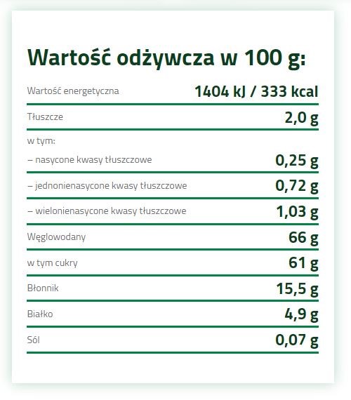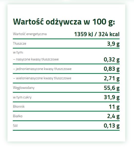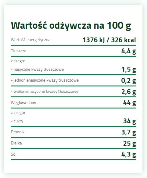 Wszystkie dodatki są naturalne, delikatnie przetwarzane i nie zawierają żadnych substancji konserwujących. Produkt w sposób naturalny jest bezglutenowy i w całości jest pochodzenia roślinnego.